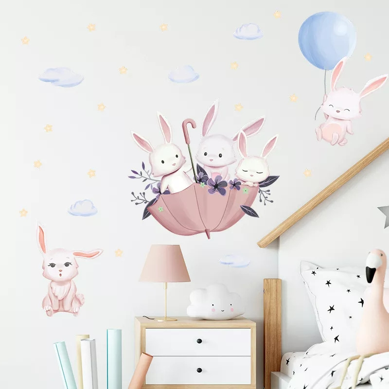 Наклейка на стіну в дитячу, на шафу, стіни "зайченята в парасольці та на повітряній кульці" 41 см*85 см